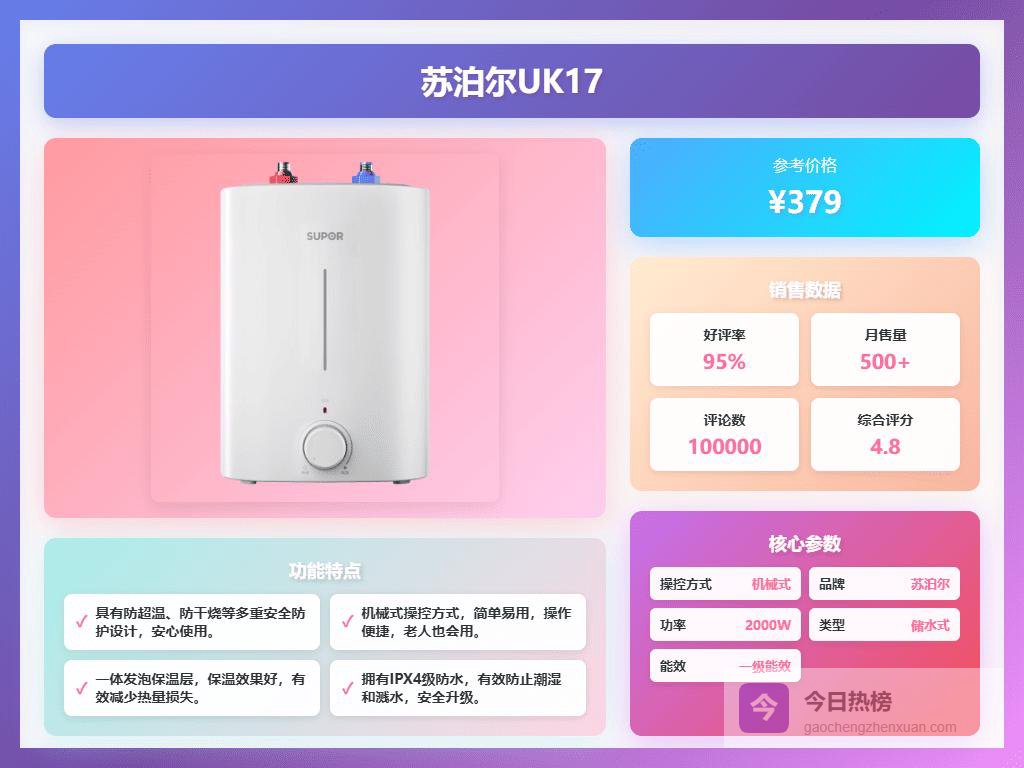 八、苏泊尔① 快速加热:这款电热水器采用2000W大功率设计,开机后几分钟就能出热水,不用等太久,洗澡、洗脸都能随时用上热水,特别方便。