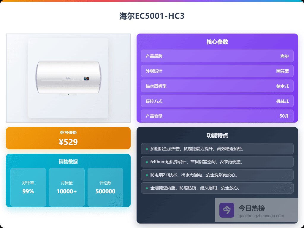 二、海尔① 快速加热:这款海尔EC5001-HC3电热水器配备2200W大功率加热元件,加热速度还挺快的,几分钟就能出热水,基本满足日常沐浴需求。不用等太久,洗澡更方便。
