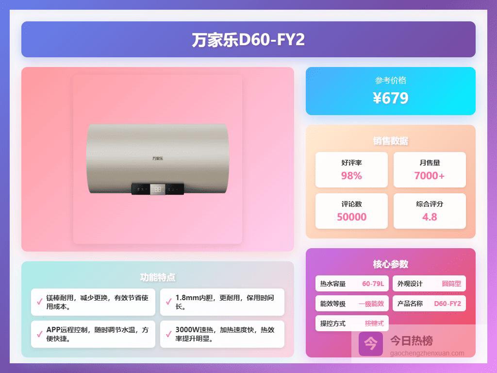 三、万家乐① 超强速热:这款万家乐D60-FY2搭载3000W的大功率加热芯,加热速度非常快,几分钟就能把冷水变成热水,不用等太久,洗澡起来更方便。无论是早上急用还是临时需要热水,这款都能帮你节省不少时间。