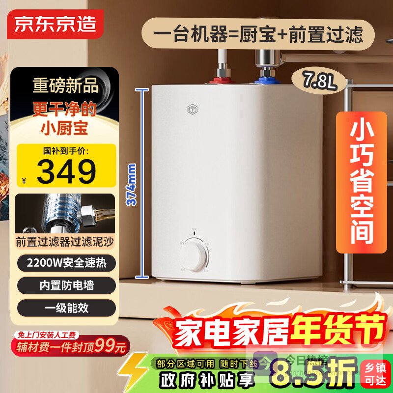 京东京造国家补贴15%小厨宝电热水器7.8升 一级能效 2200W速热家用厨房小型储水式节能保温热水宝KW7X01¥