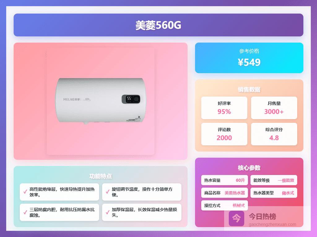 十、美菱① 快速加热:这款美菱560G采用2200W大功率,加热速度还挺快的,无论早上洗澡还是临时备用热水,都不用等太久,省事又方便。