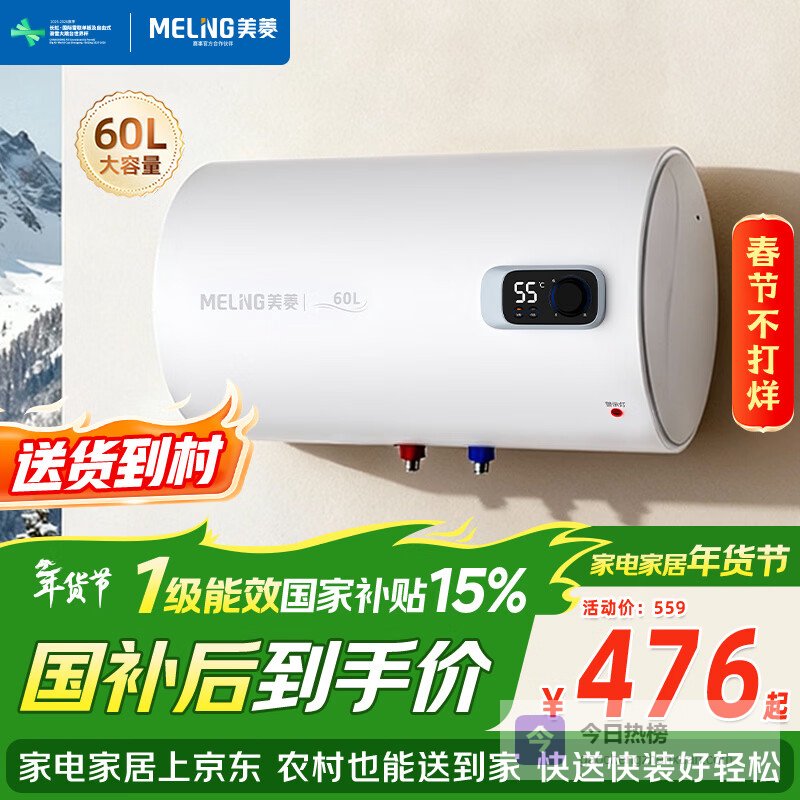 美菱电热水器60升免更换镁棒政府补贴15%一级能效家用节能储水式热水器2200W速热电脑数显质保8年560G¥