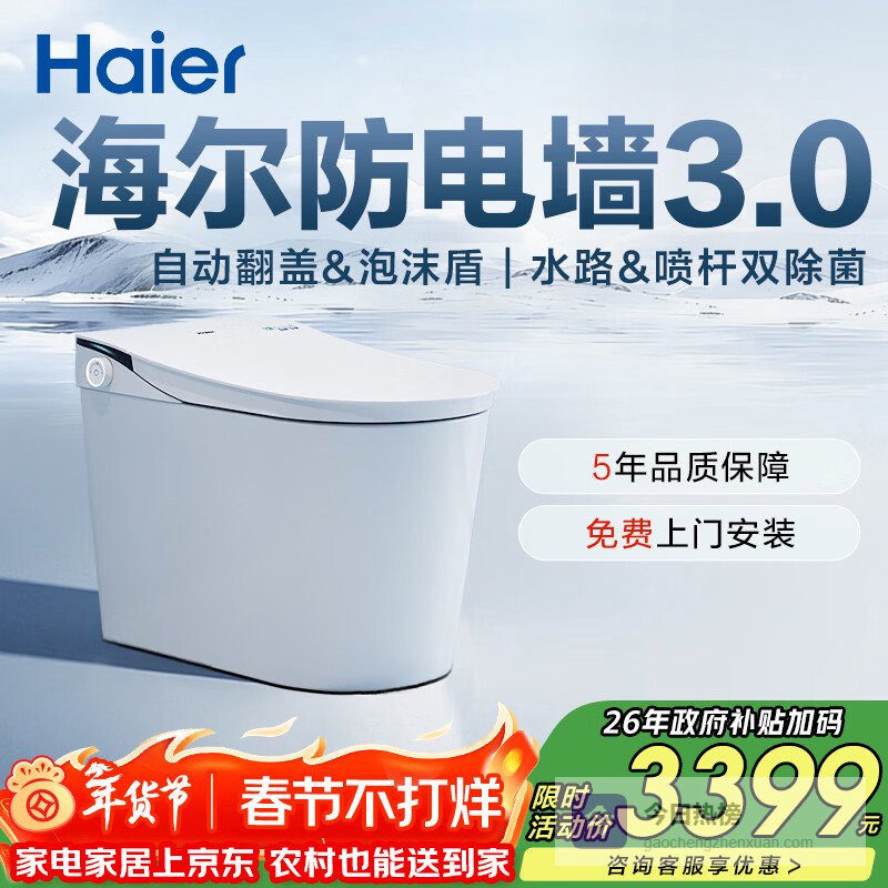推荐理由:这款海尔H3E-U30SPro智能马桶,真的是颠覆了传统马桶的体验。首先,它的纳米净泡洗技术,气泡小到只有1微米,清洁力超强,还能达到99%的除菌效果。而且,它还有3.0静音技术,冲水声音低至40分贝,安静到几乎感觉不到。还有,它的AI全域感应功能,能自动翻盖、自动开盖,甚至还能根据你的坐姿调整冲水模式,真的是太人性化了。