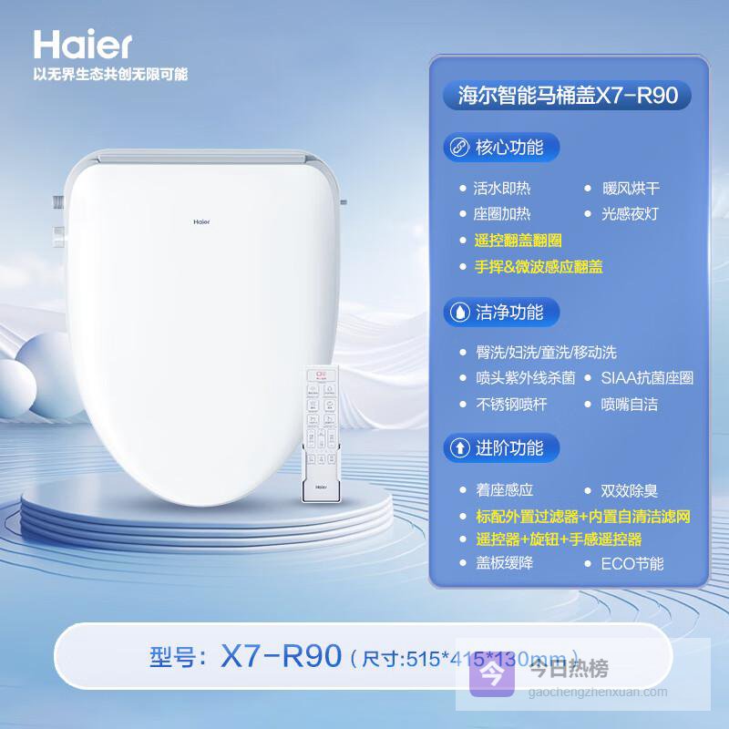 推荐理由:海尔X7-R90智能马桶盖,真的超级实用!它有四大亮点让我特别心动。首先,它的自动感应翻盖功能,真的超级方便,不用手摸就能轻松开关盖子,卫生又干净。其次,紫外线杀菌功能,杀菌率高达99.9%,让我和家人都能用得安心。再来,它的喷嘴自洁功能,每次使用前后都会自动清洗,保证了卫生。最后,它的多档位冲洗功能,无论是男性还是女性,都能找到适合自己的模式。