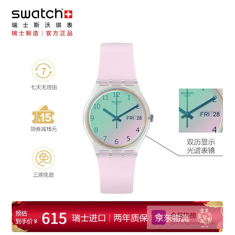 【京东自营】斯沃琪瑞士手表无尽雪粉双日历情人节礼物初高中考试表时尚腕表GE714¥