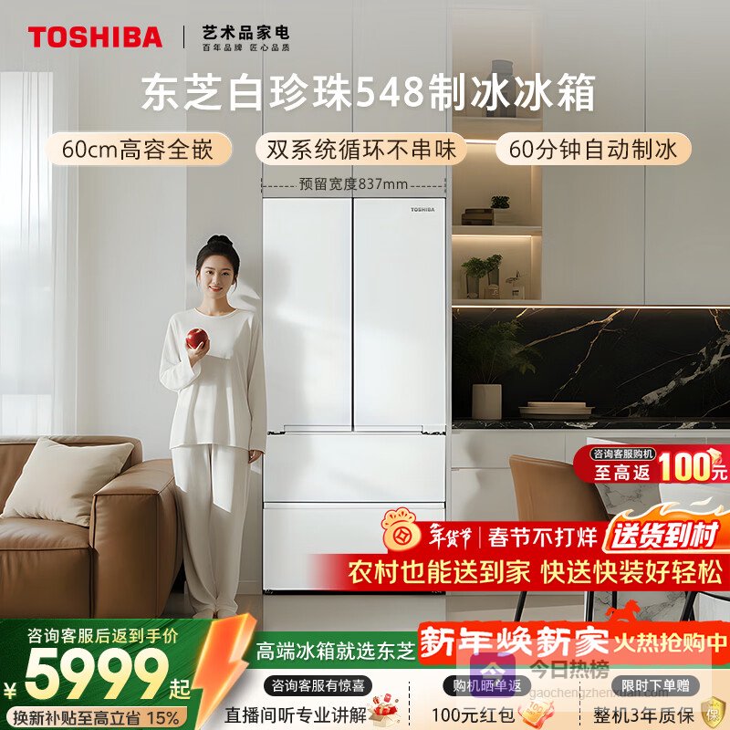 东芝(TOSHIBA)白珍珠520L法式多门冰箱548双系统自动制冰超薄嵌入式保鲜家用变频GR-RF548WI-PM165国家补贴¥