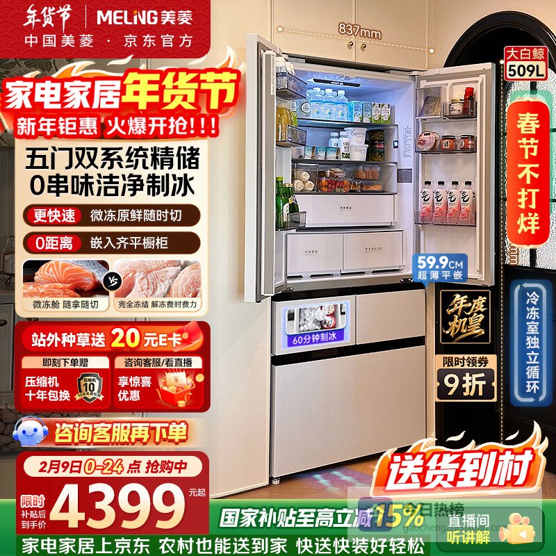 美菱年度机皇|大白鲸509L法式多门冰箱自动制冰家用双系统超薄嵌入底部散热BCD-509WPU9CZX国家补贴¥