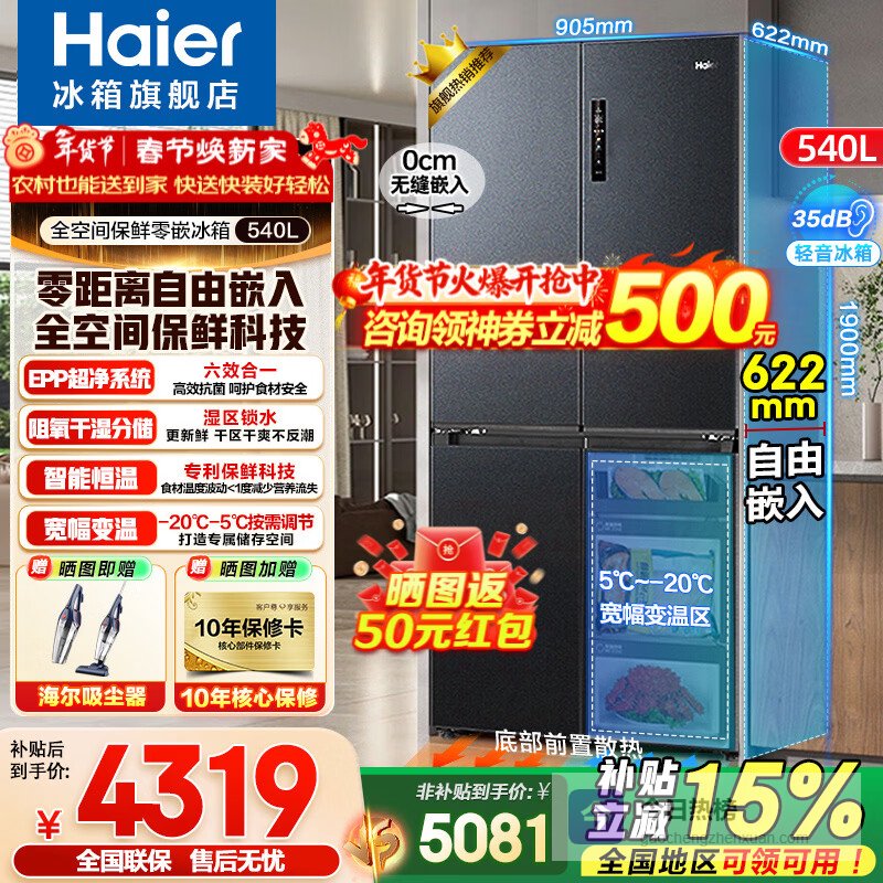海尔(Haier)冰箱540升零嵌入十字四开门全空间保鲜一级能效变频风冷无霜以旧换新补贴 零距离自由嵌入 全空间保鲜 EPP净系统¥