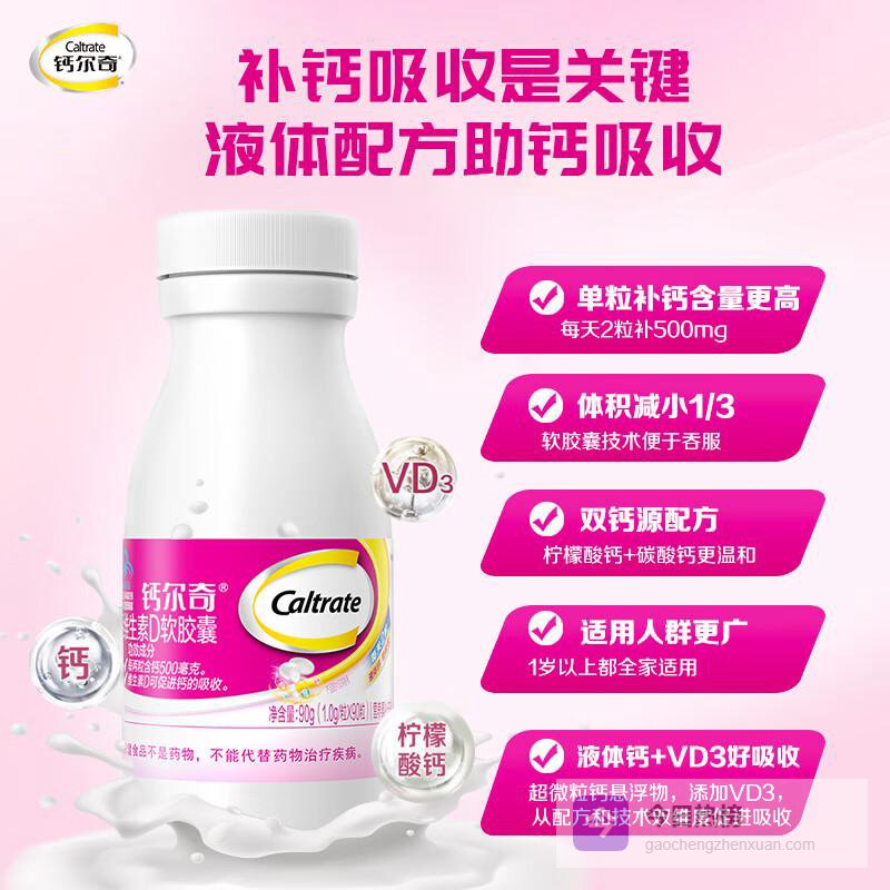 四、骨骼健康:液体钙的易吸收优势钙尔奇液体钙采用维生素D3复合配方,促进钙质吸收效果显著。相比传统钙片,液体软胶囊更易吞咽,且不会引起便秘等副作用。特别适合孕期女性、中老年人等钙质需求量大的人群。