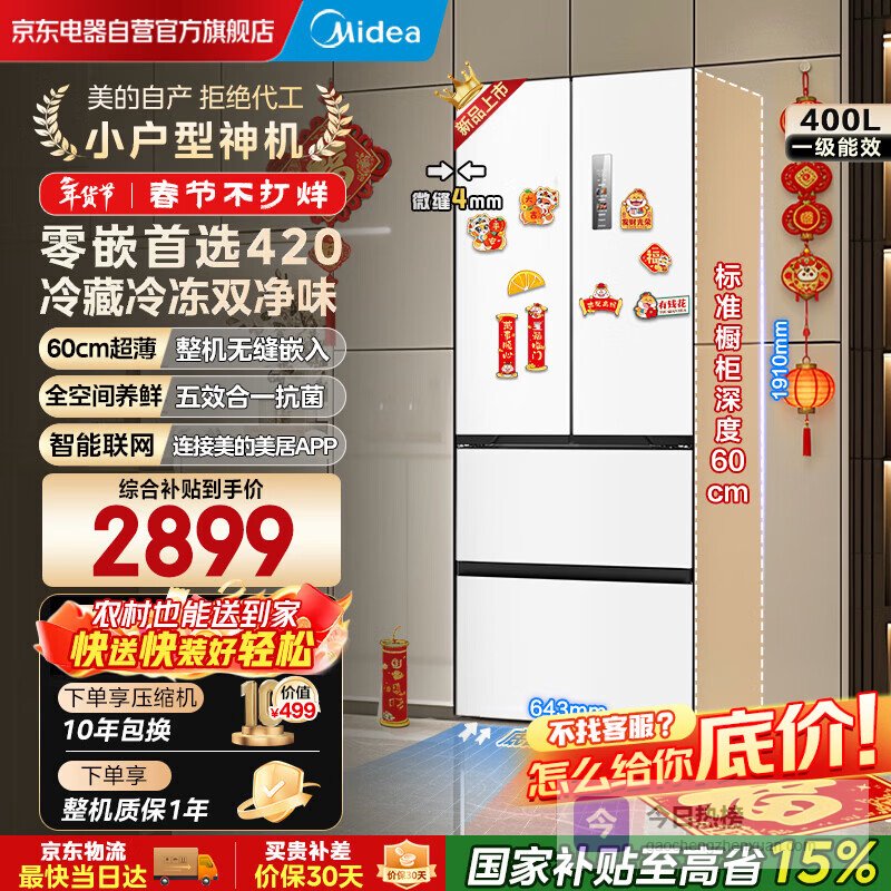 第1款:美的420L法式多门特点:双PT净味抗菌、60cm纯平全嵌、400升大容量