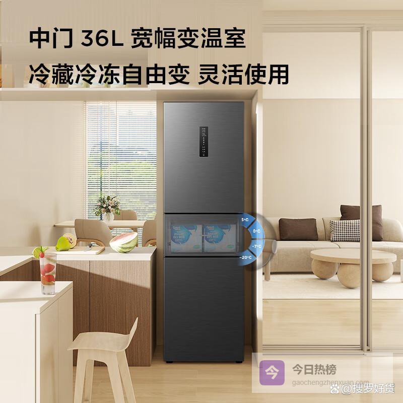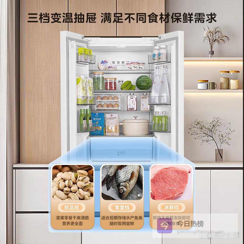 接下来,我们再来看看三门冰箱。三门冰箱是相对比较传统的一种冰箱类型,通常分为冷藏室、冷冻室和变温室三个部分。冷藏室和冷冻室的设计都比较常规,但变温室是其一大亮点。变温室的温度可以根据需要进行调节,既可以作为冷藏室的补充,也可以作为冷冻室的延伸,甚至可以设置为零度保鲜,以满足不同食材的储存需求。三门冰箱的优点是价格适中,功能齐全,适用性强,无论是单身贵族还是三口之家,都能找到合适的产品。缺点是冷藏室的空间利用率可能不如法式门冰箱,存放较大体积的食材可能需要调整一下。