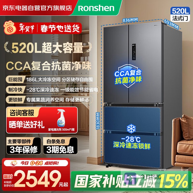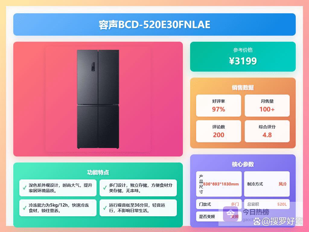 第3款:容声BCD-520E30FNLAE特点:520L大容量、双变频节能、风冷无霜、抗菌净味