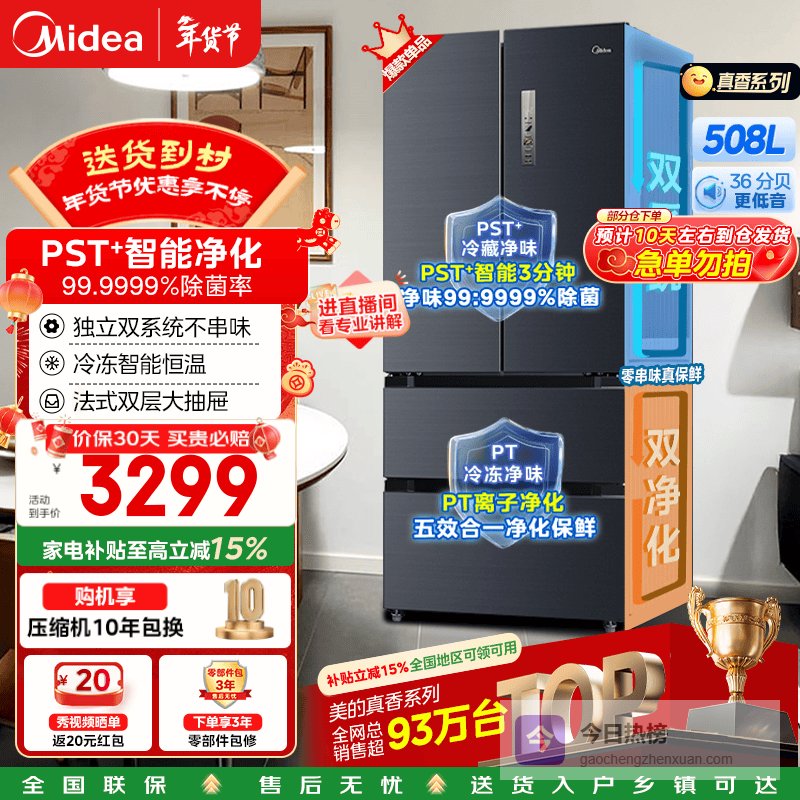第2款:美的BCD-508WTPZM特点:508L大容量、PST+净味、双系统循环、智能变频