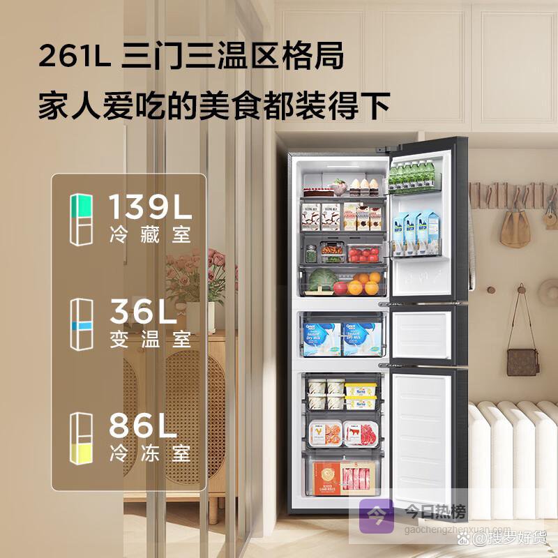 第2款:TCL R261V7-C这款TCL冰箱261L容量,三门设计,冷藏、冷冻、变温三个区隔开,食材能更精细地分开放。风冷无霜这点挺好,省了手动除霜的麻烦,冷冻室是3个大抽屉,像雪糕、冻肉都能分开,避免串味。变温室可以自己调温度,范围是零下20度到5度,灵活度挺高。