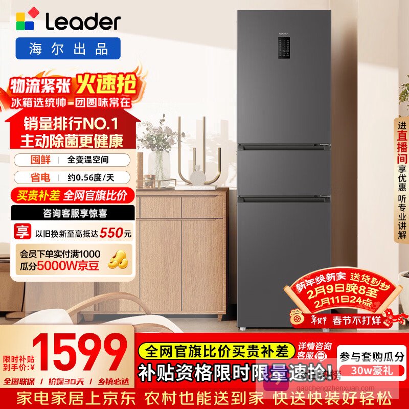 统帅(Leader)海尔冰箱出品悦享系列218L三门家用小冰箱一级能效风冷BCD-218WGLC3D7S9U1售完即止只退不换¥