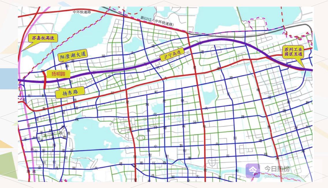 1.2 ▣ 扬明路-沙苑路-缤特力路:1114米“空中走廊” 北起阳澄湖大道,主线以双向四车道桥梁形式上跨沪宁高速,止于扬东路交叉口,全长1114米,按城市主干路标准建设。地面辅路与高速各成系统,南北向车辆可无缝切换,大幅缩短跨区通行时间。