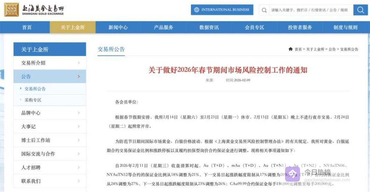 就在2026年2月9日晚上,当很多投资者还在关注现货黄金价格重新突破5000美元大关时,上海期货交易所和上海黄金交易所几乎同时发布了一则重磅通知。 通知的核心内容非常直接:自春节前最后一个交易日起,大幅上调多个期货和延期合约的交易保证金比例和涨跌停板幅度。 这个动作发生在长假前夕,被市场普遍解读为监管层应对节日期间国际市场不确定性的主动风控升级。