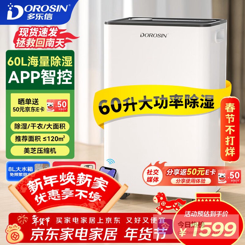 多乐信(DOROSIN)除湿机/抽湿机 60升/天120㎡ APP智控大功率别墅办公室地下室商业家用回南天吸湿干衣除潮 ER-60¥