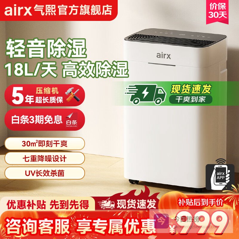 第2款:气熙D1轻音除湿机这款除湿机除湿能力确实不错,官方数据是日除湿量能达到18L,大户型还有60L的型号可选,基本能满足不同大小空间的需求。试了下,在高湿环境下的除湿速度还挺快的,体感舒适度提升明显,像南方梅雨季或者回南天,用它来对付湿漉漉的墙面和地面,我觉得还行。而且它适用性广,客厅、卧室、浴室都能用,还有名义除湿和高温除湿两种模式,可以根据不同湿度环境灵活选择。