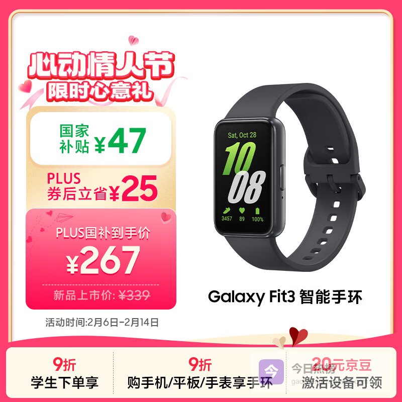 【京东自营】三星Samsung【国家补贴】Fit3智能手环/运动手环1.6英寸AMOLED大屏水墨黑¥