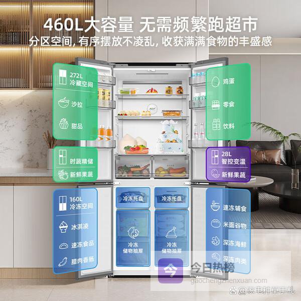 2、美菱460升十字双开这款美菱冰箱配备了变频技术,能效等级达到一级,运行时噪音低至36分贝,使用体验非常静音。它拥有460升的大容量,其中冷藏空间占272升,冷冻空间160升,空间分配合理,存放各种食材都没问题。多层空间设计让你可以轻松调节搁架高度,存放大件蛋糕或瓶装饮料十分方便。