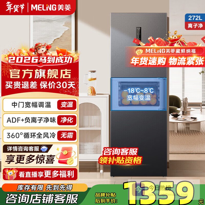 美菱离子净272升三门三温租房家用客厅宿舍小型一级能效节能变频风冷无霜电冰箱 BCD-272WP3CX-灰¥