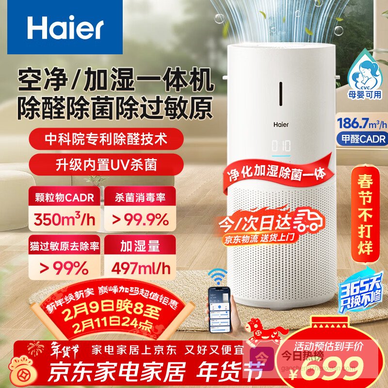 【京东自营】海尔空气净化器家用无雾加湿一体机除甲醛除苯宠物吸毛消毒杀菌除过敏原除粉尘除烟异味KJ32¥
