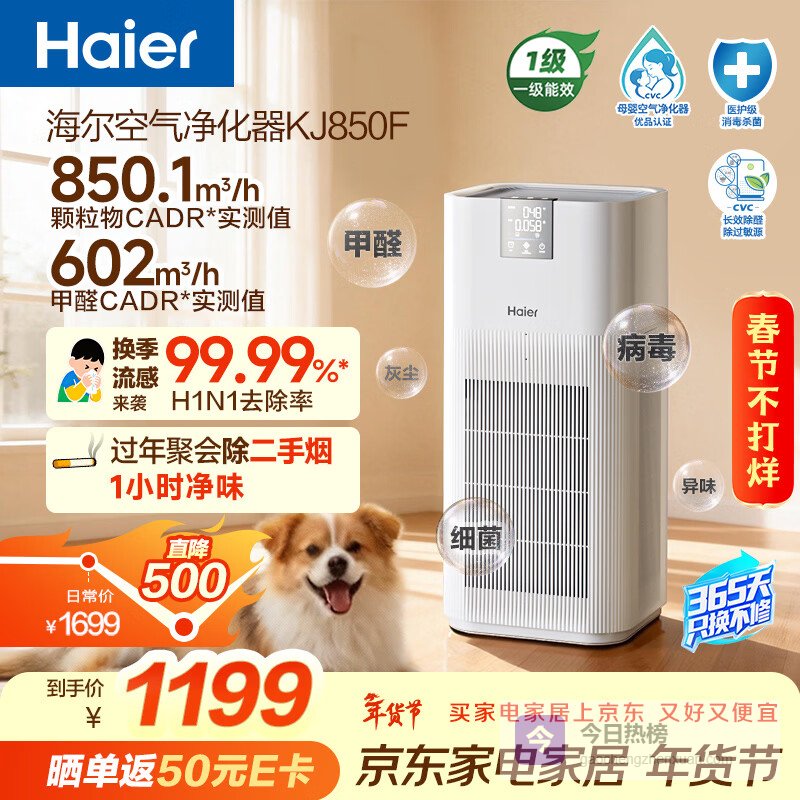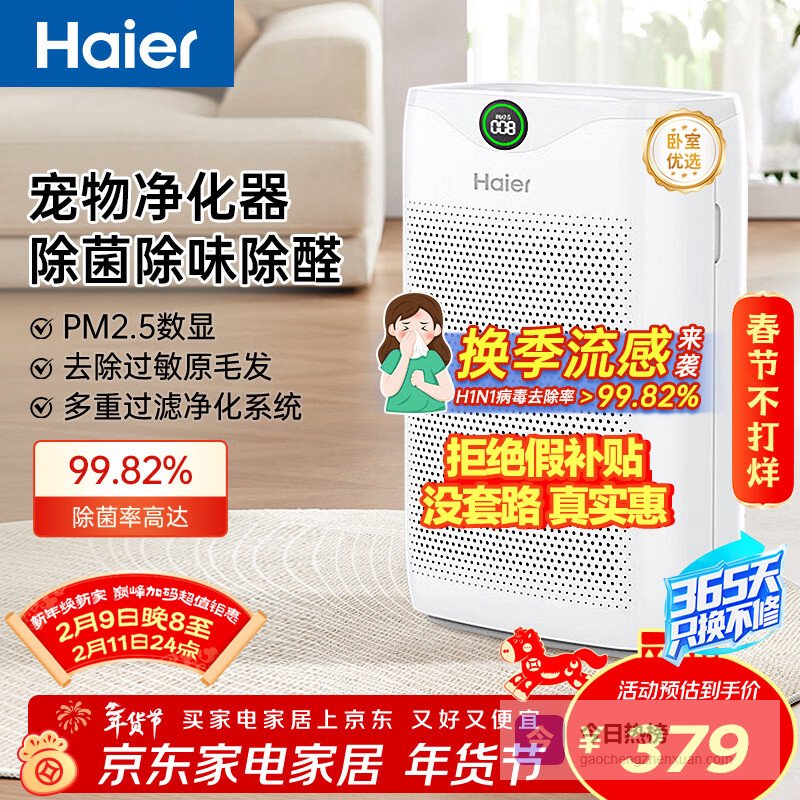 【京东自营】海尔【旗舰爆款】空气净化器除甲醛流感除过敏原防雾霾沙尘母婴认证除菌除宠物异味二手烟白巧K¥