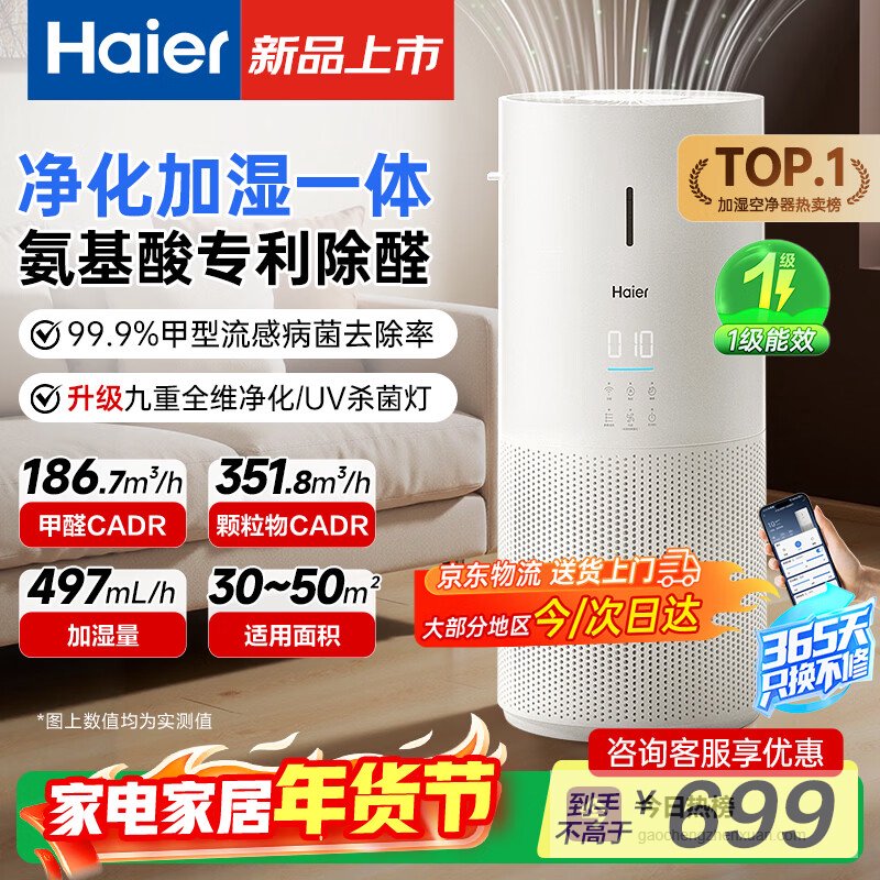 【品牌直营】海尔【新品上市】空气净化器家庭用卧室内除甲醛消毒除菌除烟味除宠物异味净化无雾加湿一体机K¥
