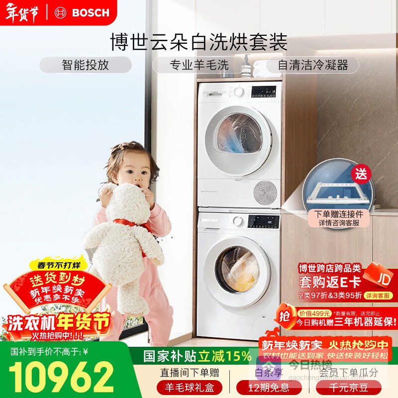 【京东自营】博世云朵白大容量热泵烘干机智能投放除菌除螨洗烘套装WGE252A0AW+WQA254D0¥
