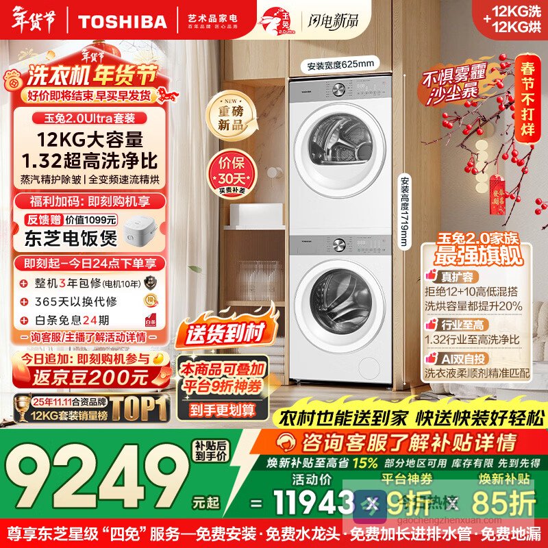 【京东自营】东芝玉兔2.0Ultra洗烘套装12公斤大容量滚筒洗衣机+变频热泵烘干机超微泡全变频蒸汽¥