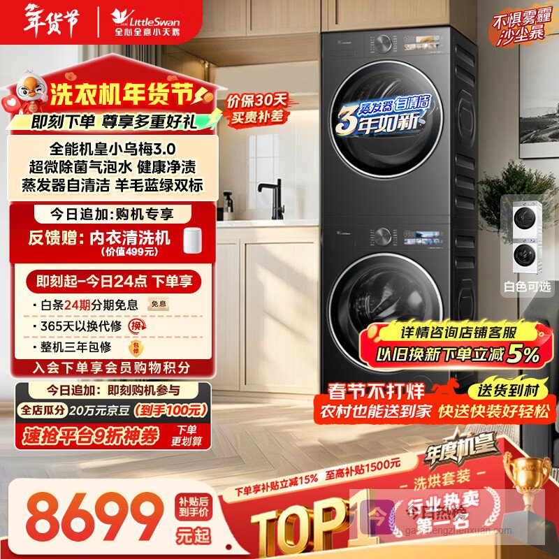 核心优势:全能洗烘套装,具备强大的洗涤与烘干能力,让居家洗护更轻松无忧。