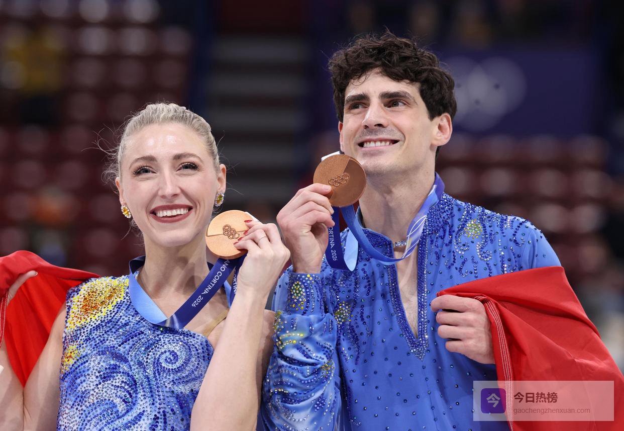 ↑2月11日,季军加拿大组合吉勒斯/波里尔在颁奖仪式后合影。新华社记者 陈益宸 摄
