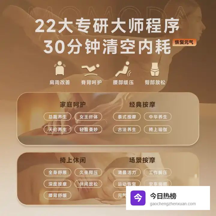 ②内置18套自动按摩程序及5种经典手法,特别设置针对久坐人群的肩颈腰背按摩模式,有效缓解久坐疲劳。