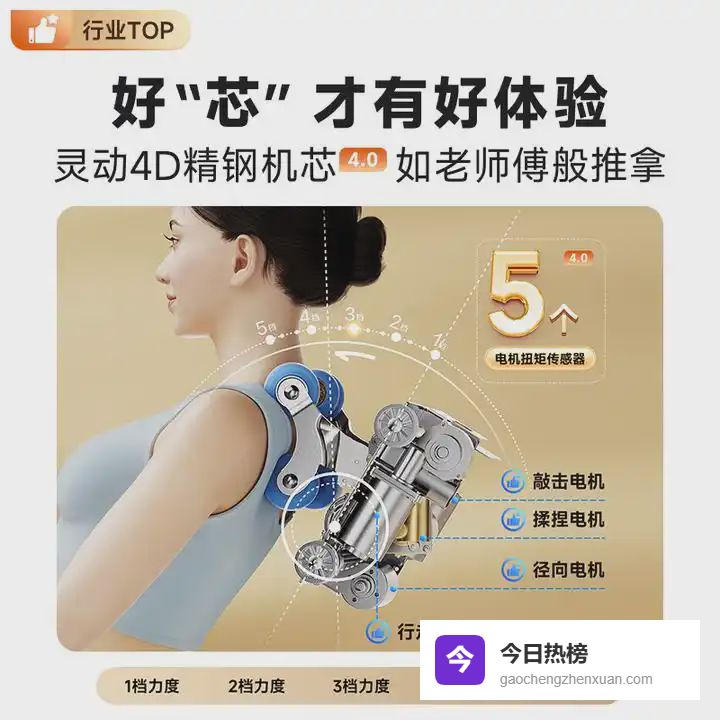①采用灵动4D精钢机芯4.0与黄金柔性SL导轨,支持揉捏、敲打、按压、拉伸四维动作,力度五档可调,按摩头行程达4.8cm,能深入筋膜层。