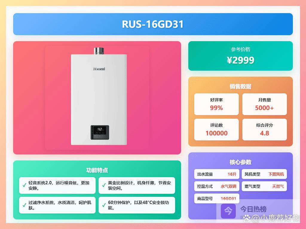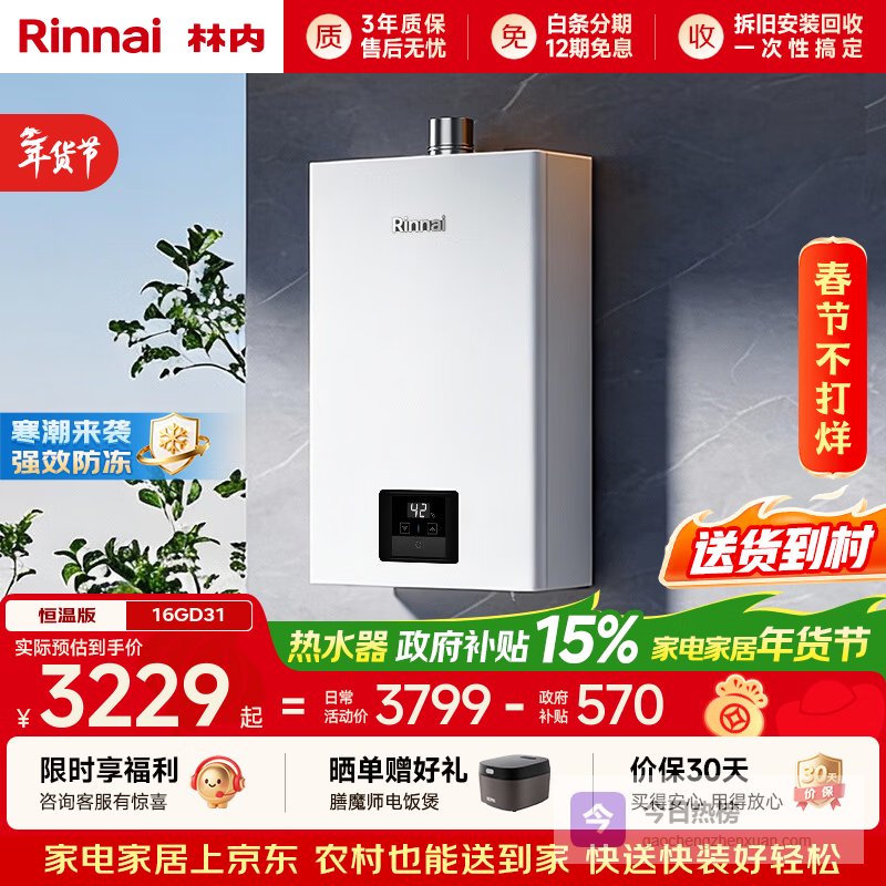 推荐理由:这款林内RUS-16GD31燃气热水器的智能恒温系统,采用全新升级的CPU,能精准控制水温,让你每次洗澡都能享受稳定的温度体验,绝不会忽冷忽热。微火苗技术更能避免水温过高,使用起来更安心,也更省电。