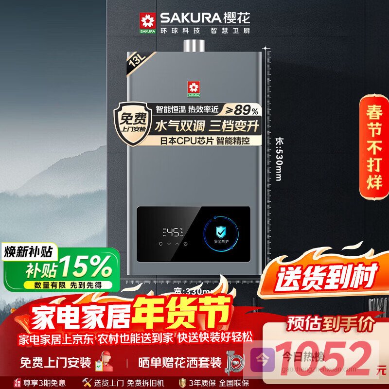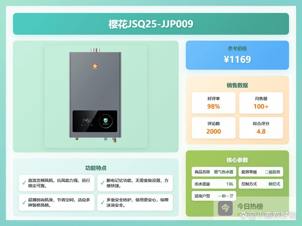 推荐理由:这款樱花JSQ25-JJP009燃气热水器,确实挺实用的。它采用水气双调控温技术,让水温稳定,几乎没有波动,洗澡不用担心忽冷忽热。尤其适合一厨一卫的家庭,燃热出水量达到13L,用水速度快,满足日常沐浴所需,不会等太久。