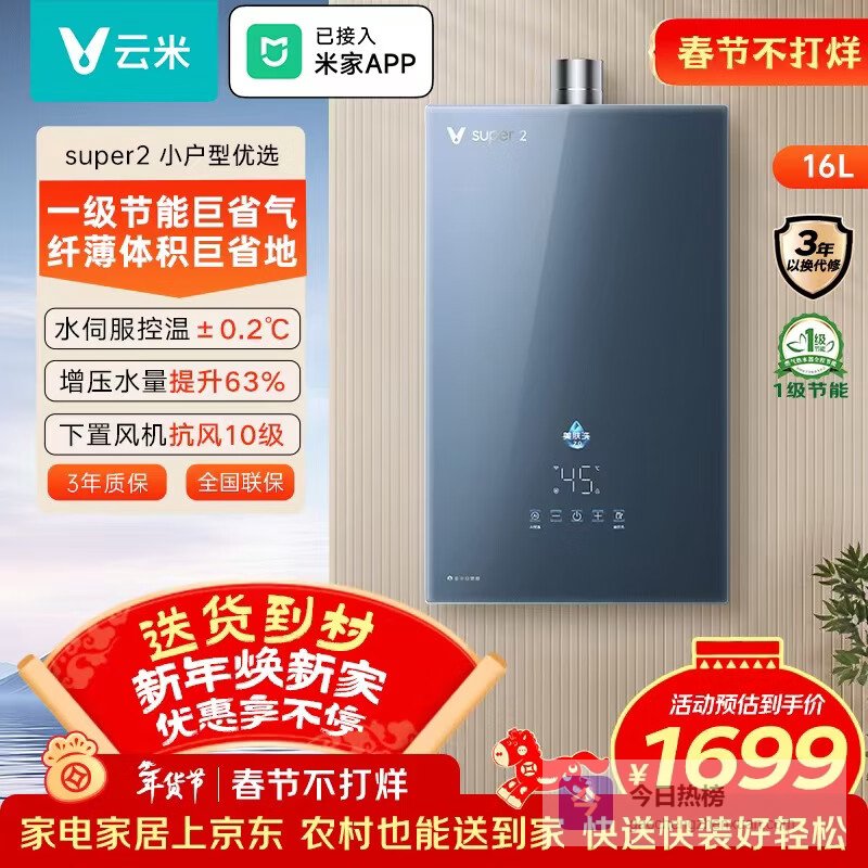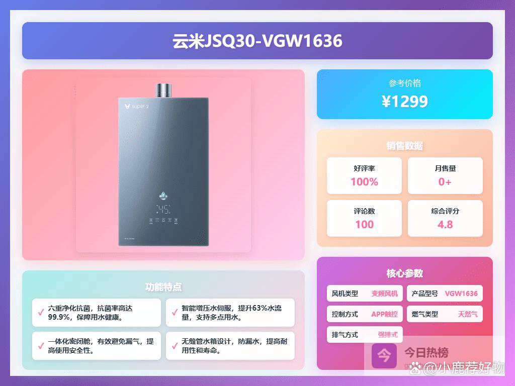 推荐理由:这款云米燃气热水器,采用先进的无极变频燃烧技术,让你用水时温度更稳定,波动只有±0.2°C,淋浴体验更舒适,不容易忽冷忽热。即使天气不好,大风抗风10级,也能保证燃烧稳定,使用更安全。