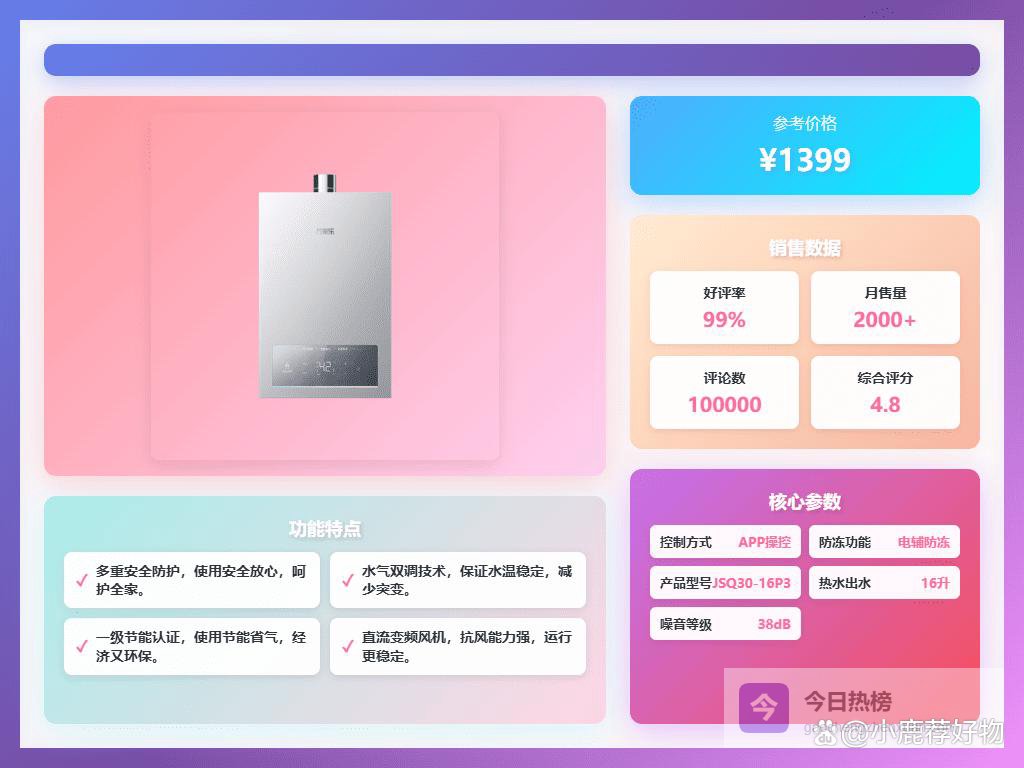 安全方面也有保障,六重防冻和多重安全保护设计,即使在寒冷的天气里也不用担心冻坏,还配备漏电保护、燃气泄漏检测,使用起来放心又安心。外观简洁大气,触控屏操作方便,噪音控制在38dB左右,洗澡也能享受安静的环境。整体来说,性能稳定、使用安全、节能环保,是家庭用热水的不错选择。