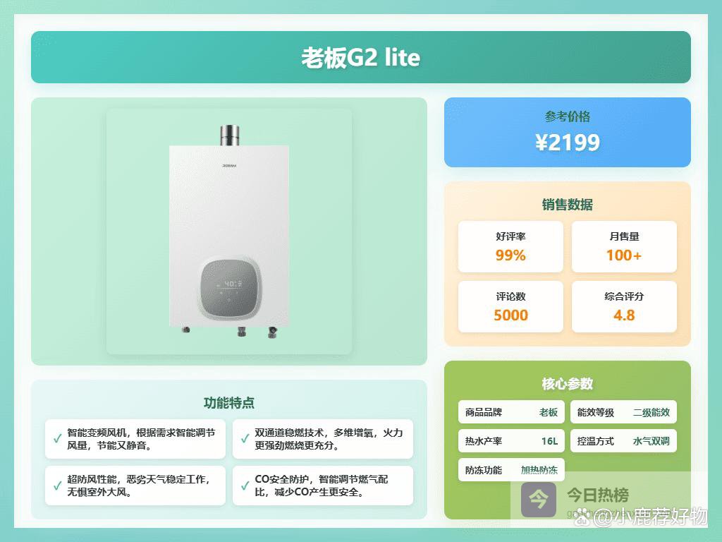 推荐理由:这款老板G2 lite燃气热水器,采用智能控温技术,能精准控制水温,水温误差不到±0.5℃,洗澡体验非常舒适,不会忽冷忽热。它还能根据用水习惯,自主学习预热,让你随时用热水,零冷水体验真不错。