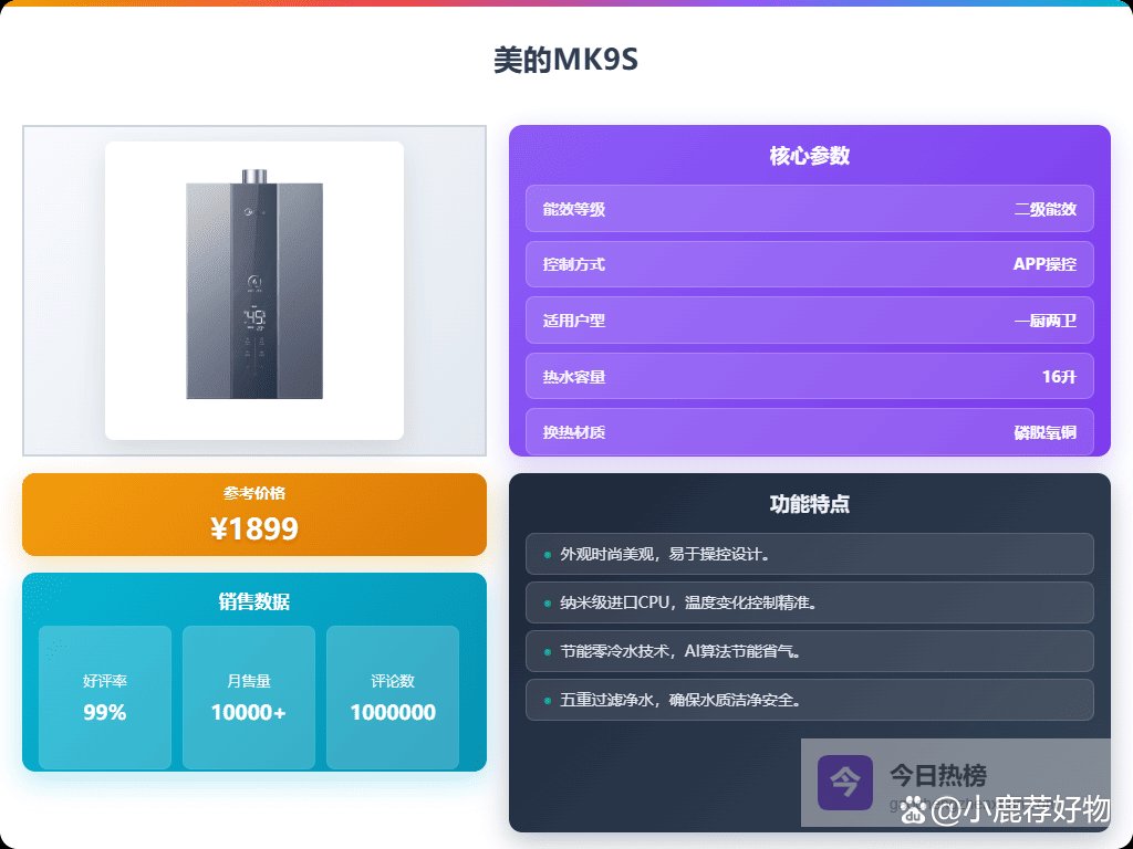 总体来说,美的MK9S不仅在功能上挺全面,操作也很方便,APP远程控制让你出门在外还能调节温度,使用起来确实靠谱,家庭用水需求都能得到满足。