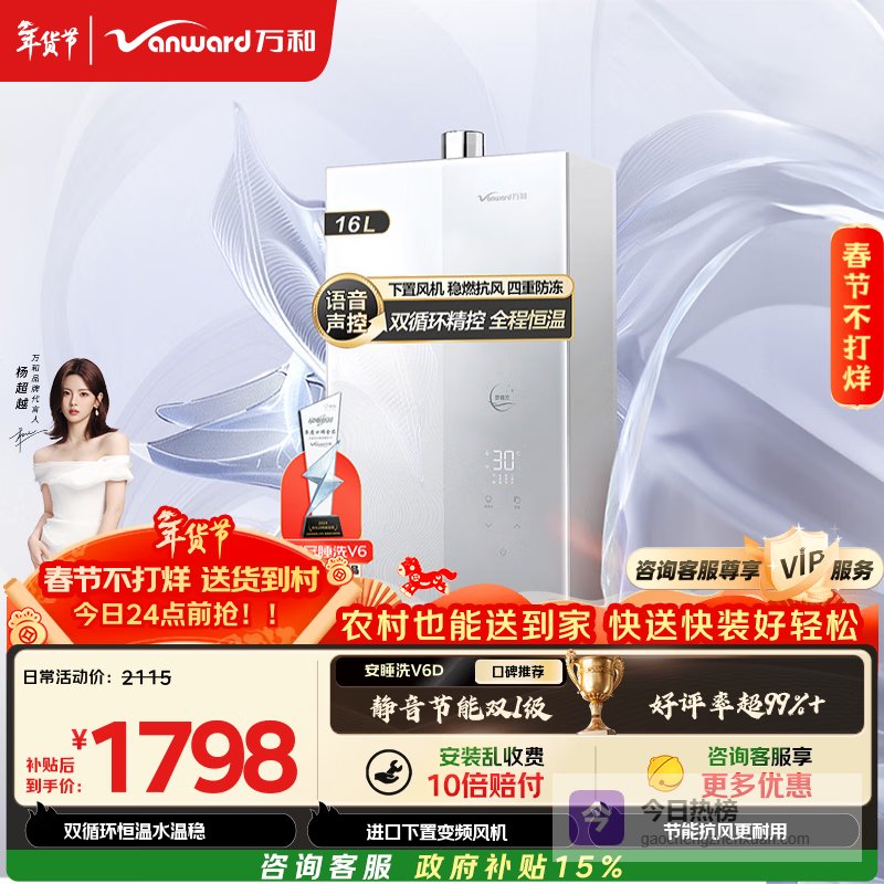推荐理由:这款万和JSQ30-V6D16燃气热水器,采用双循环恒温技术,保证每次出水都能保持0.1℃的精准温度调节,洗澡时完全不用担心水温忽冷忽热,体验非常舒适。它还能实现全程恒温快速出热水,让你一开即享受热水,不用等太久。