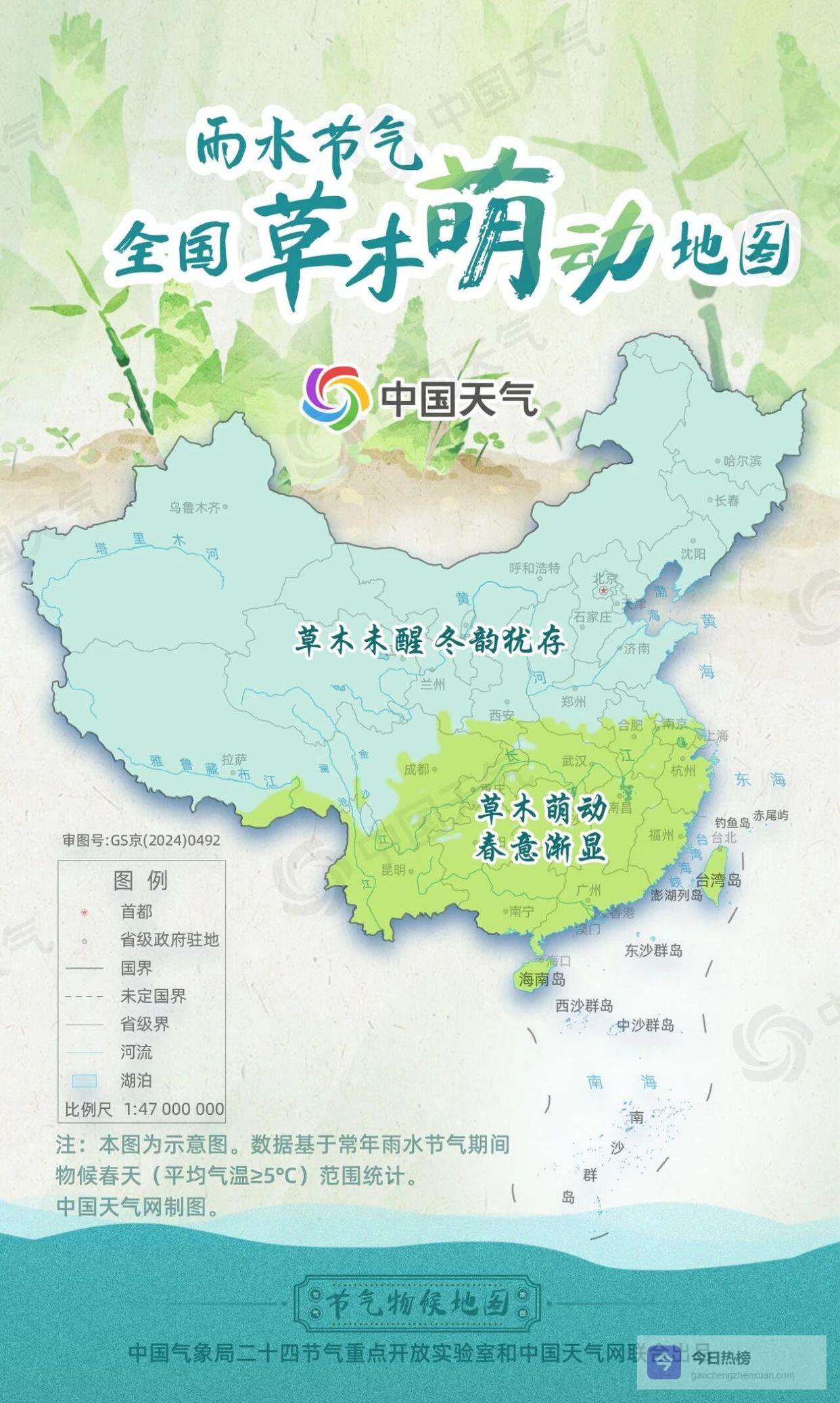 从全国草木萌动地图来看,常年雨水节气期间南方大部草色渐显,嫩芽纷纷吐绿,一幅生机勃勃的早春画卷在眼前徐徐展开。当南方春意萌发之时,北方大部仍处于冬季,气候较干燥,草木依旧沉眠,静待新生。