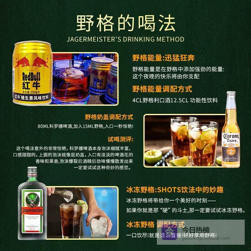 野格是一款源自德国的草本力娇酒,以其独特的草药风味获得了广泛关注。其秘制配方中蕴含多达56种植物成分,创造出了既苦又甜的复杂口感,非常适合用作开胃酒或消食酒。野格还常与其他酒品搭配,增加饮品的层次感。