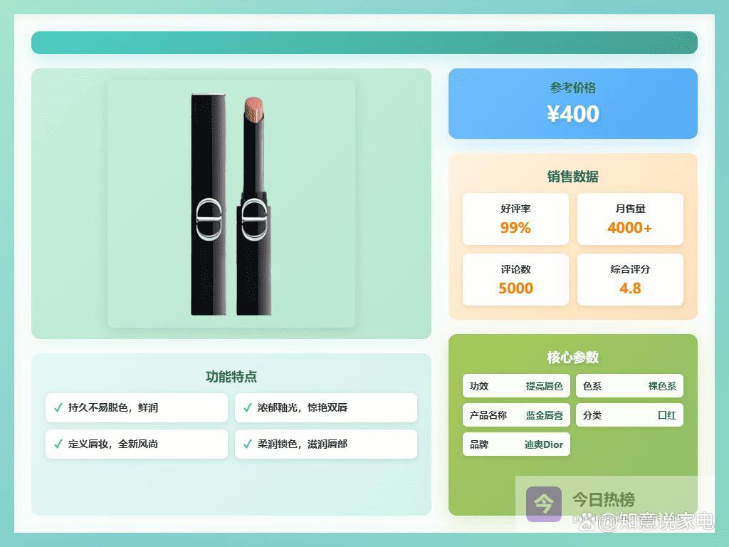 这款口红还配备了高级水光效果,打造水润光泽的唇部妆容,显得更有精神。外壳设计也挺时尚的,多变的风格可以随心换搭,无论日常还是特殊场合都很合适。它的智慧显色技术让色彩更饱满,涂上后双唇更立体,配合水润护唇配方,还能有效呵护娇嫩唇部。