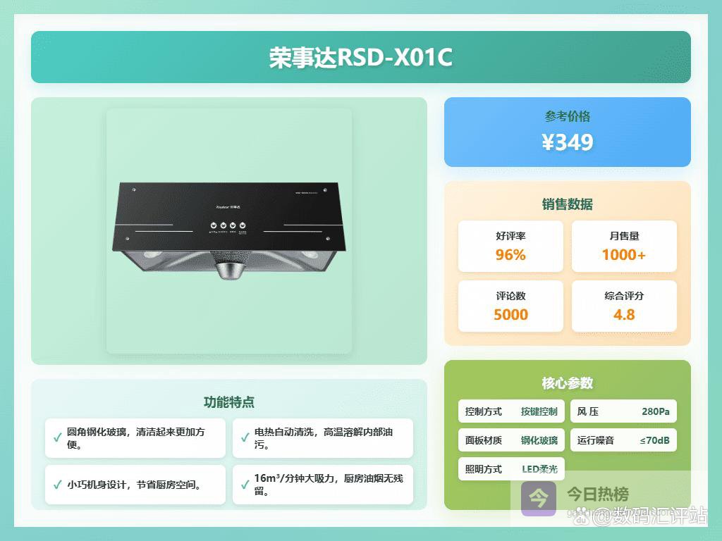 二、荣事达这款荣事达RSD-X01C油烟机配备了四个按键控制,操作起来挺直观,基本不用担心误操作。它还能实现自动电热清洗功能,高温加热能有效溶解油渍,日常清理省事不少,试了下确实方便。高效的排风能力,排风量达16立方米每分钟,油烟被迅速抽走,厨房空气更清新。
