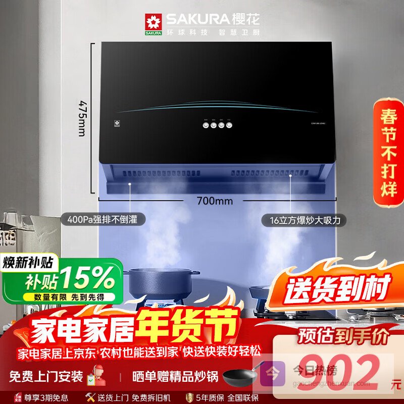 樱花(SAKURA)抽油烟机家用经典中式油烟机700mm小尺寸16m³/min大风量CXW-260-JZA02¥