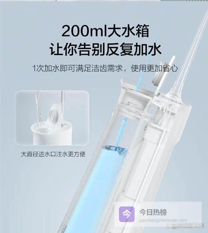 大容量设计:200ml水箱一次加水满足整套洁齿过程,方便无需频繁加注,有效提升使用体验与效率。