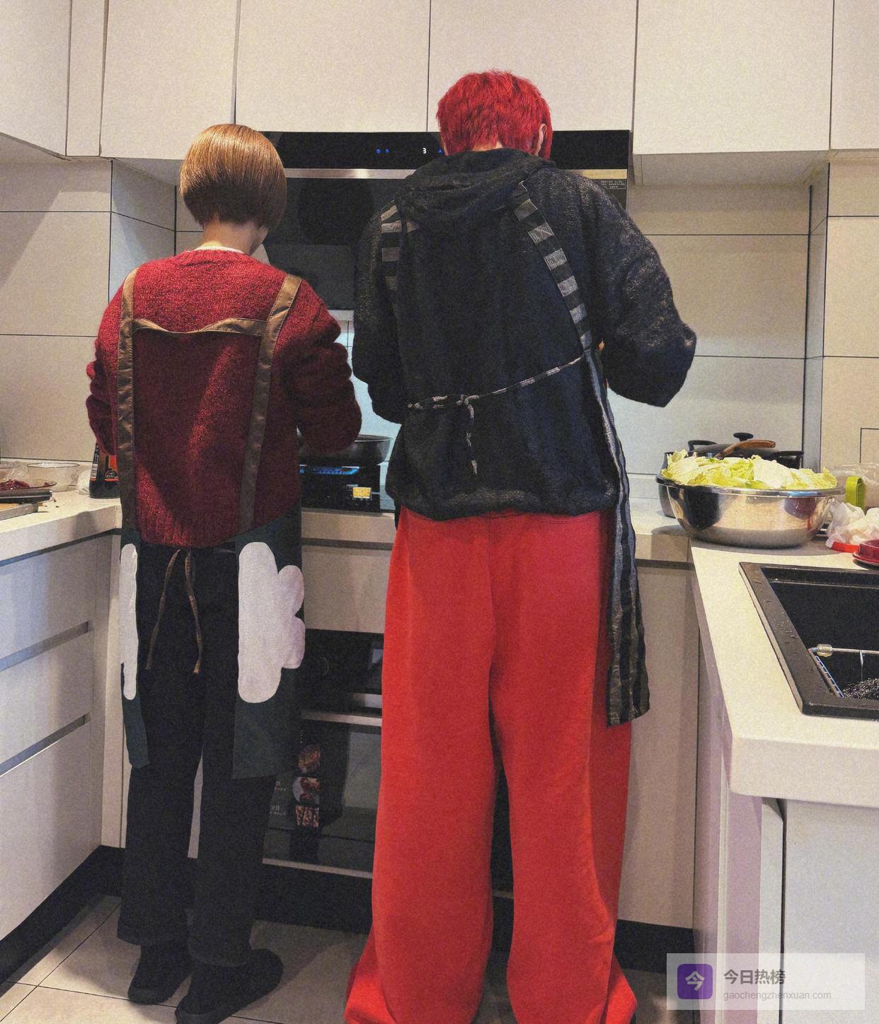 他们夫妻俩在厨房的背影被拍了下来,衣着打扮挺像情侣服,身高啥的,感觉两人搭配得挺合适。