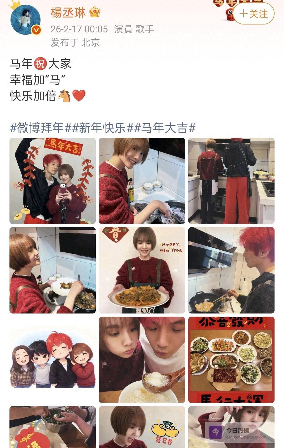 2月17日,也就是大年初一的凌晨刚刚过去,杨丞琳就在社交平台上分享了自己家的年夜饭。她写道:“马年祝大家,幸福加马,快乐加倍。”